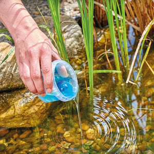AquaActiv DuoBoost is the two-phase booster for a healthy pond biology. The first phase of action consists of a highly active fluid gel containing enzymes and bacteria that remove organic dirt, ammonium, nitrite and nitrate. This also activates the filter bacteria. The second phase of action is balls measuring 2 cm, or a single ball of 5 cm diameter. These dissolve over time, releasing important trace elements, co-substrates, minerals and valuable additives that are otherwise difficult to put into an artificial pond.